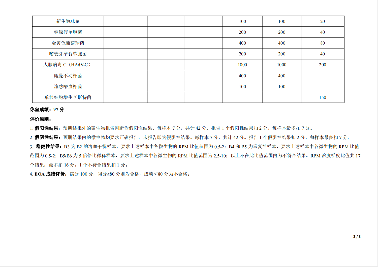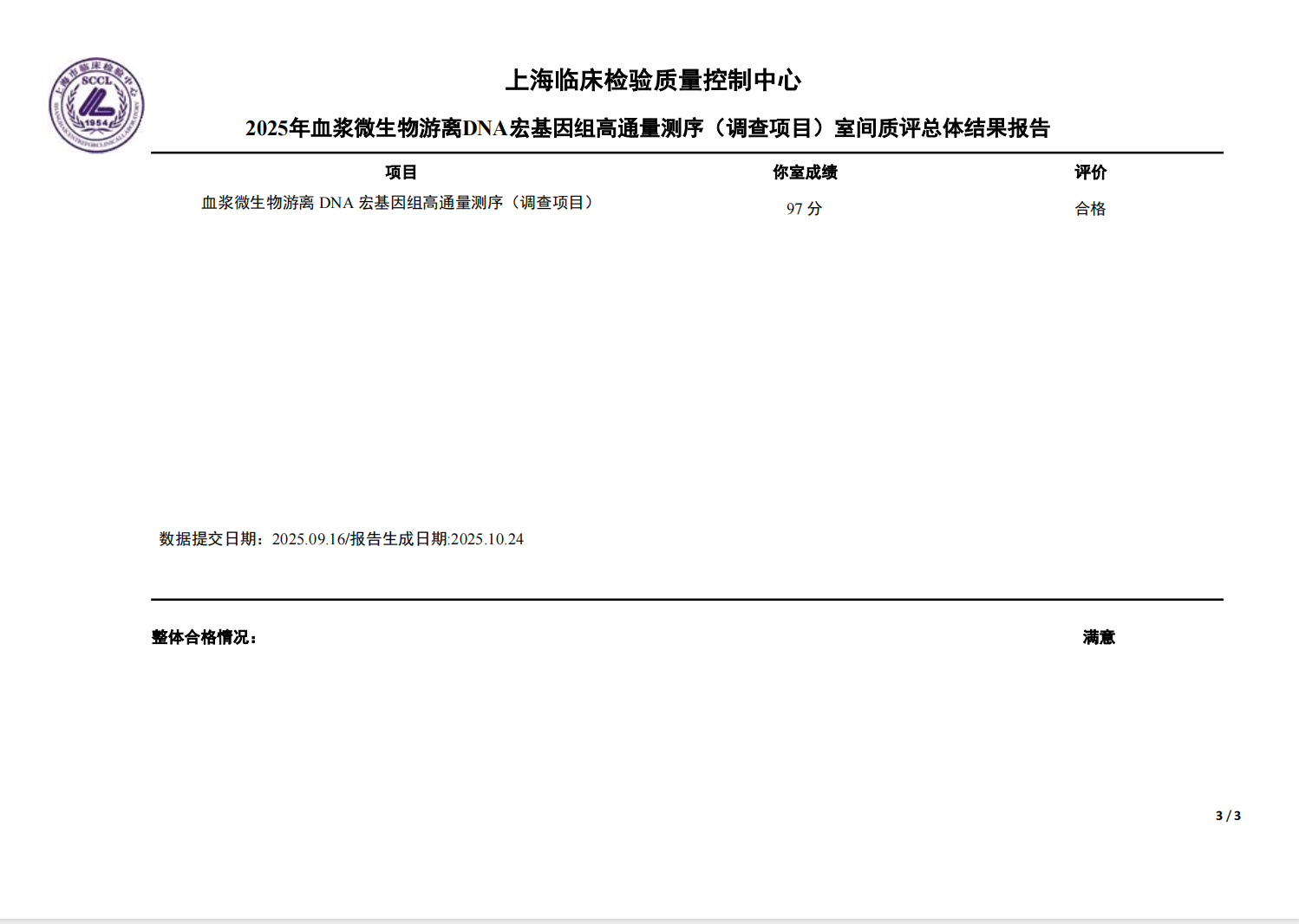 近日,上海临床检验质量控制中心公布了《2025年血浆微生物游离DNA宏基因组高通量测序(调查项目)室间质评结果报告》。康圣环球旗下子公司上海信诺佰世凭借自主研发的宏基因组检测技术平台及严格的全流程质控体系,以高分成绩通过本次严苛考评,再次彰显了其在病原微生物精准诊断领域的技术实力与质量管理水平。