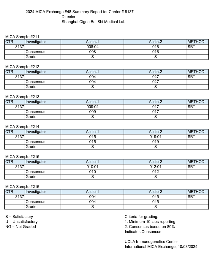 近日,美国加利福尼亚大学洛杉矶分校(UCLA)免疫遗传中心2024年室间质评结果公布。上海信诺佰世参评的HLA高分辨基因分型,MICA基因高分辨分型,HLA抗体检测和KIR基因分型均以S级的满分成绩通过。证明上海信诺佰世具有良好的结果溯源性和严格的质量管理,检验结果得到国际权威认可。
