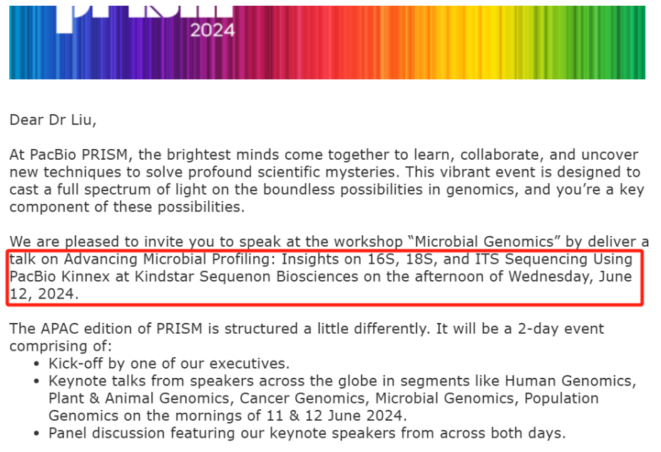 作为全球PB Revio全长16S/18S/ITS新产品的首个倡议者 ,康圣环球旗下康圣序源总经理刘雷博士受PacBio官方邀请将参加本次会议,并将在2024年6月12日下午举行的“微生物基因组学”单元上发表英文演讲,主题是:微生物基因图谱解析技术升级:康圣序源基于PacBio Kinnex的16S,18S和ITS测序的新见解。本次交流既是践行康圣序源“与PacBio用户需求同频共振,不断用技术创新惠及客户科研需求”宗旨的生动说明,也是进一步在国际领域点燃Revio全长16S/18S/ITS产品热度的话题性事件。